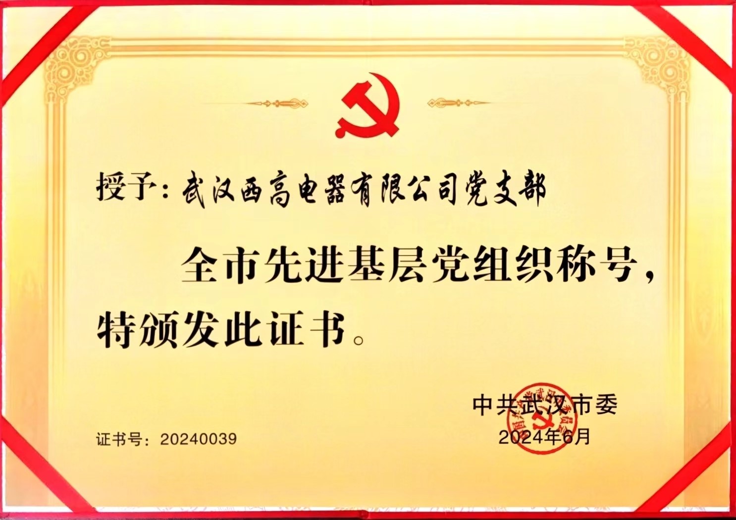 2024年6月28日,武漢市“兩優(yōu)一先”表彰大會(huì)舉行,武漢西高電器有限公司黨支部榮獲武漢市“先進(jìn)基層黨組織”。西高電器黨支部書(shū)記、董事長(zhǎng)周雄出席表彰大會(huì)。榮譽(yù)照亮前行之路,全體西高人將不忘初心,鼓足干勁,再創(chuàng)佳績(jī)!
